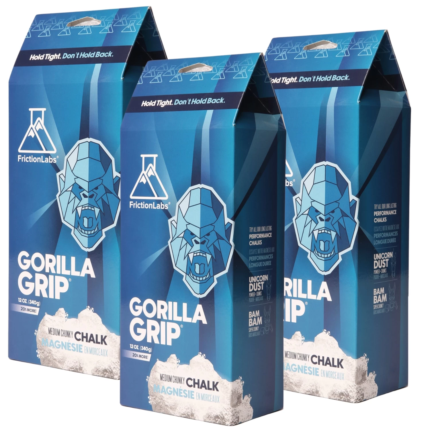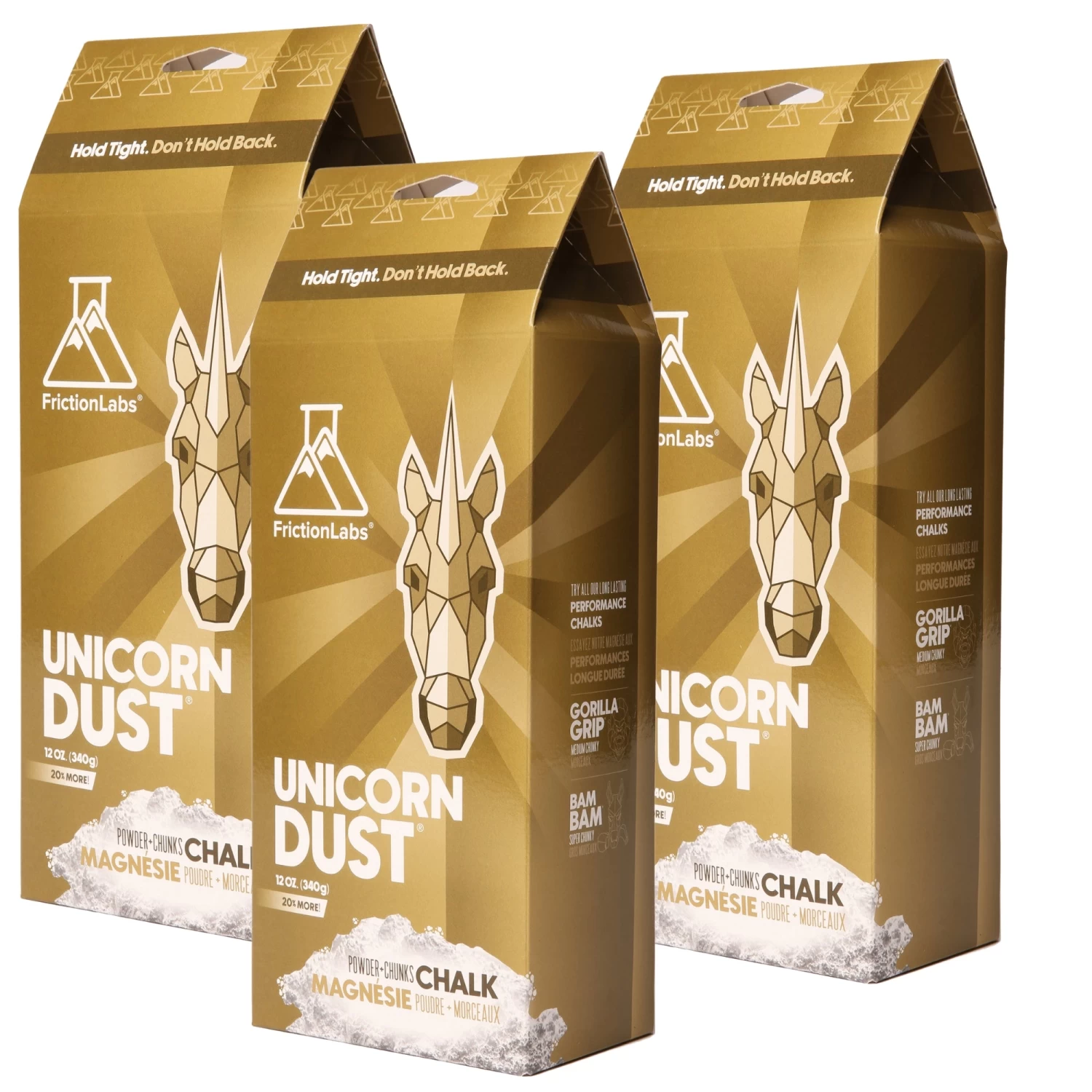 Friction Labs use a proprietary process to create high-performance chalk with an extremely high Mg: Ca ratio. Because climbers have different texture preferences, FL make their chalk into 3 distinct blends: Bam Bam (Super Chunky), Gorilla Grip (Chunky) and Unicorn Dust (Fine).