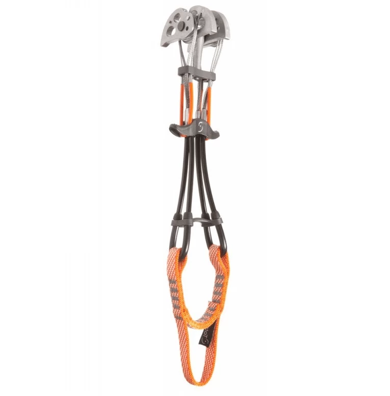 A super narrow head width and option to load only one side of the cam make these Totem Cams unique. Downward force is optimally transferred to each lobe of the cam, making this one side loading feature particularly significant in irregularly sided cracks where standard designs can lead to inactive cam lobes. Due to the innovative nature of these cams it is well worth reading the instructions supplied with it: particularly the points regarding the optimal range (between 50% and 90% closed), the clipping arrangements, and the lack of cam stops.