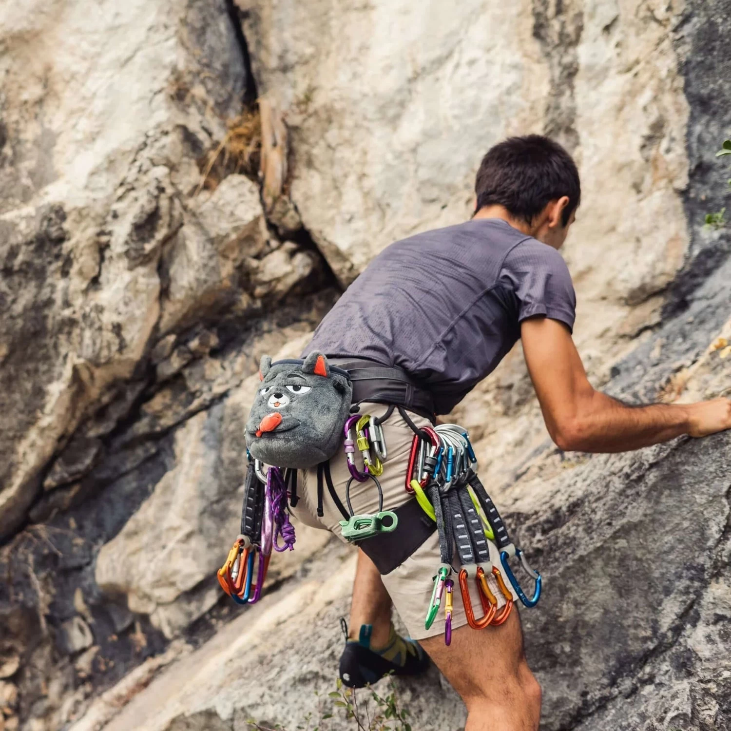 This mischievous little cat will support you on your climbing adventures. The YY Cat chalk bag includes a drawcord closure, an adjustable waist strap and a brush holder. Suitable for kids and grown-ups alike, this is a well-constructed full-sized chalk bag made from super soft materials.